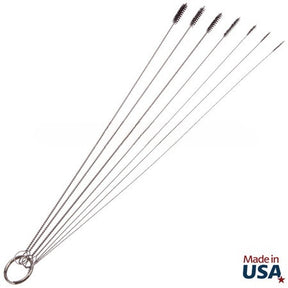 Our set of seven 12-inch micro tube cleaning brushes is specifically designed for cleaning very small diameter tubes, including airbrush and tattoo equipment, medical and lab tubes, miniature pipes, and other narrow spaces. Made with stainless steel wire and durable black nylon bristles, these brushes are ideal for precision cleaning in hard-to-reach areas. Whether for professional or industrial use, these brushes ensure thorough cleaning of delicate equipment. Made in the USA for superior quality and durability.