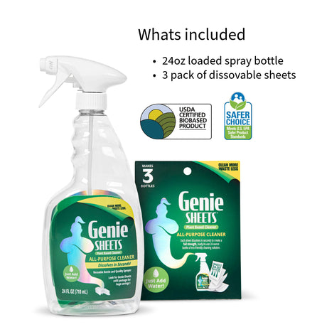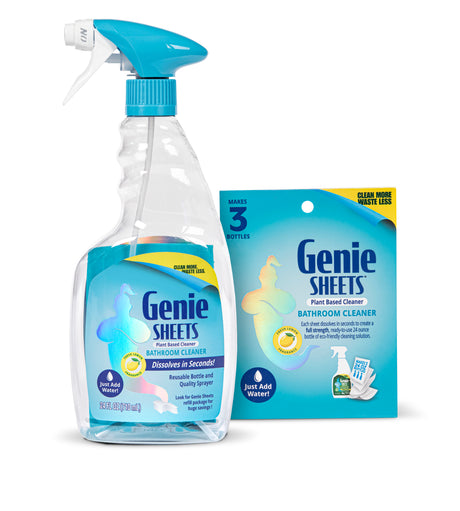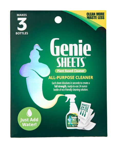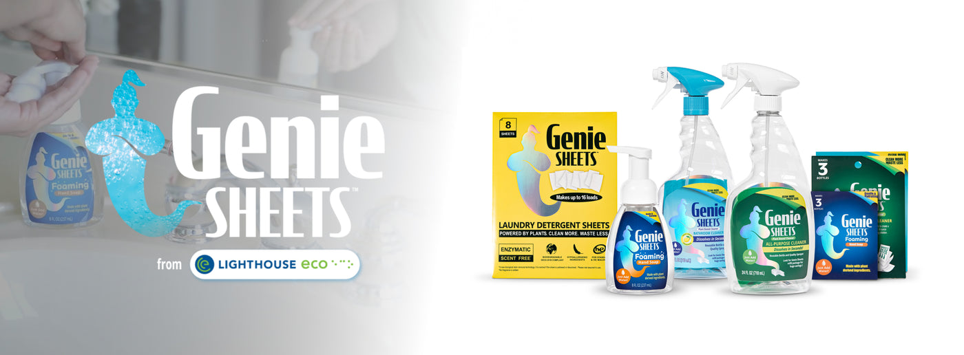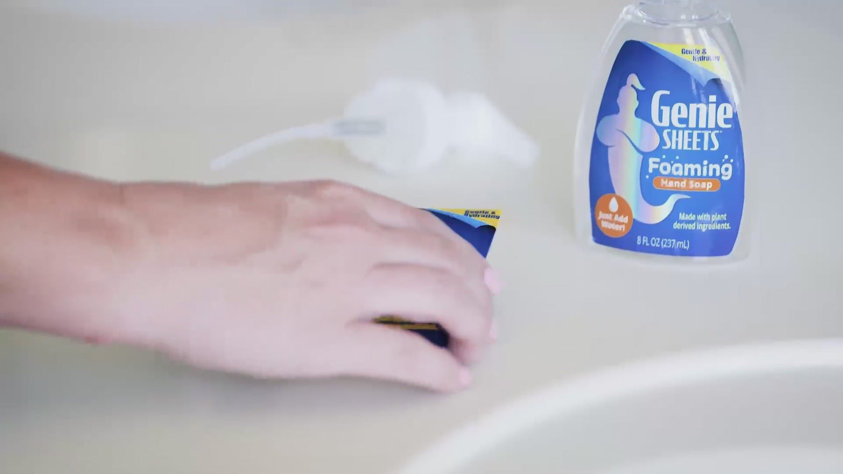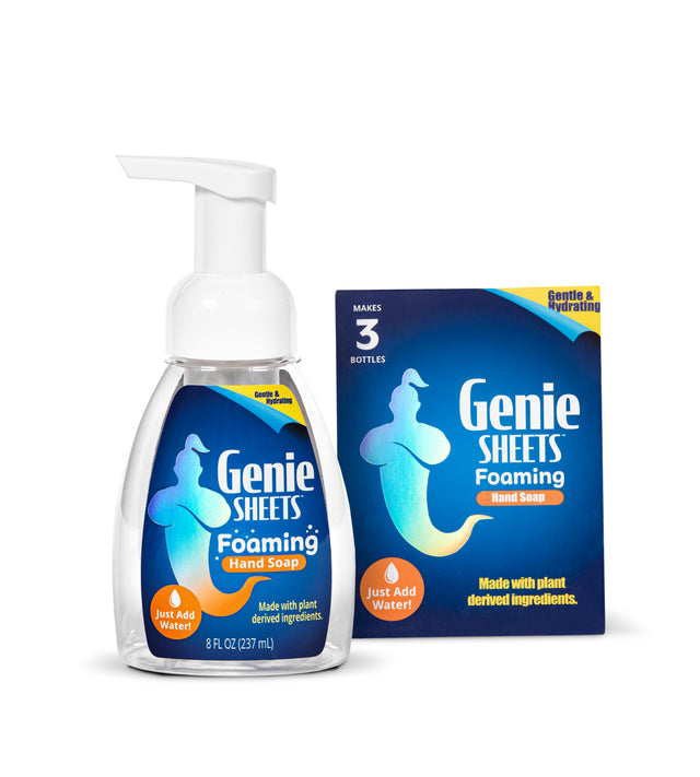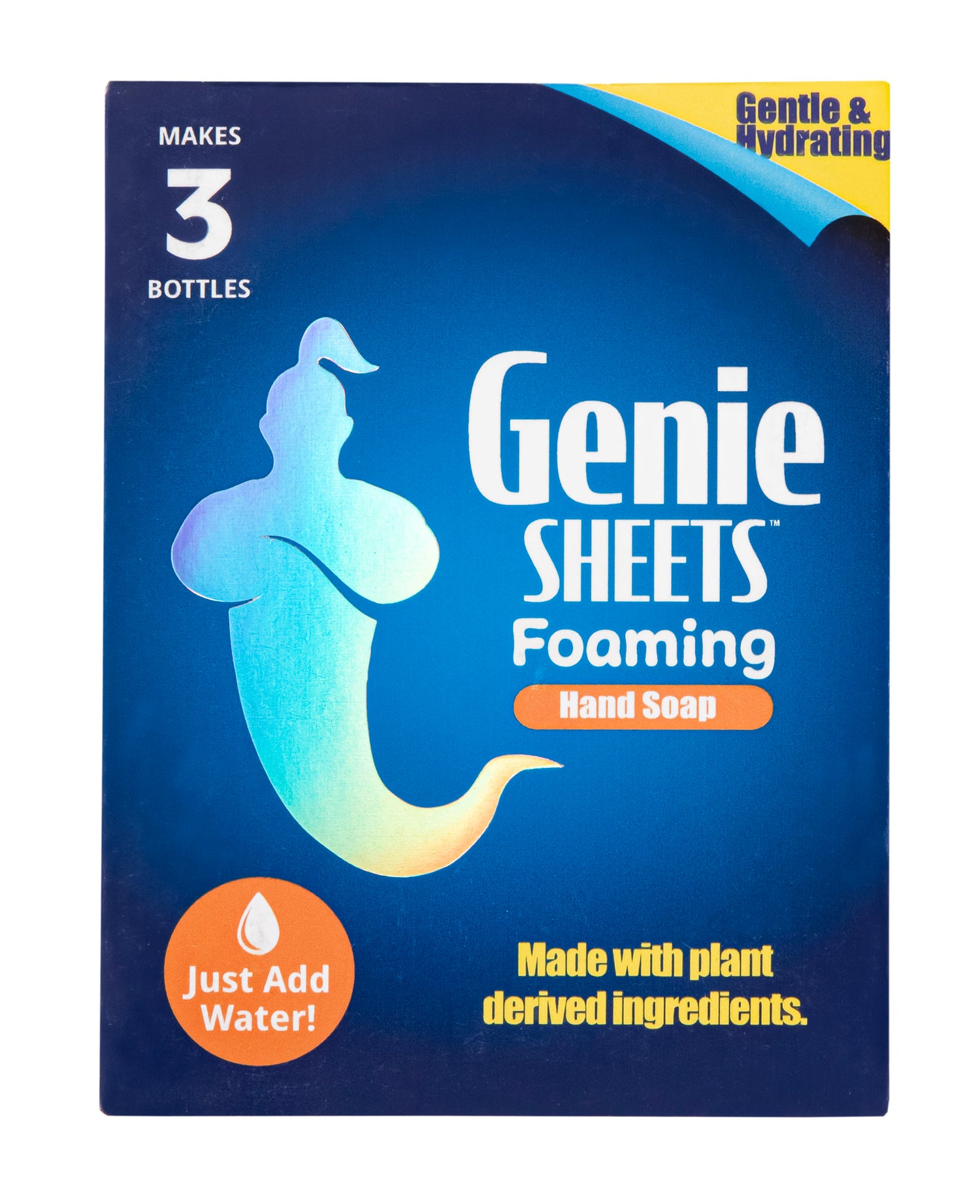 Genie Sheets are USDA certified biobased dissolvable hand soap sheets. Each sheet turns into a full bottle of gentle foaming hand soap when added to water.