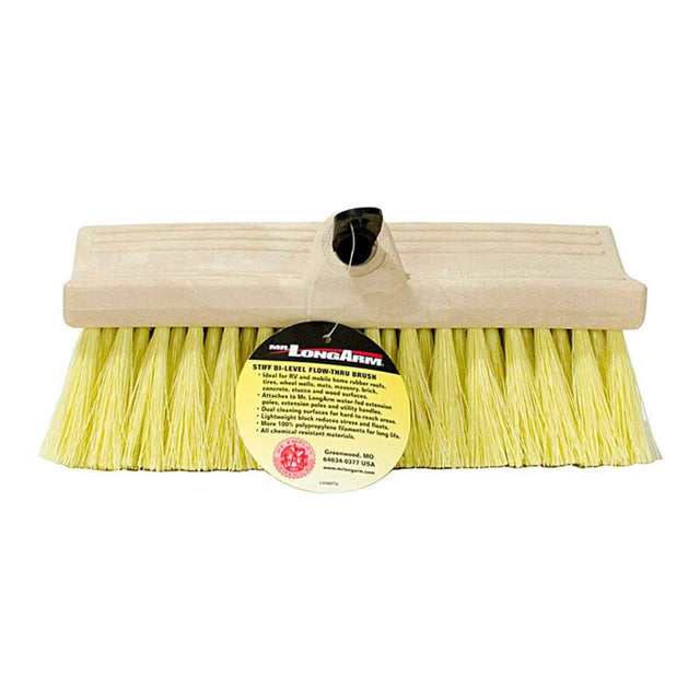 Bi-level wash brush with stiff fibers is ideal for RV and mobile home rubber roofs, tires, wheel wells, mats, masonry, brick, concrete, stucco and wood surfaces. Attaches to Mr. LongArm water-fed extension poles, extension poles and utility handles.