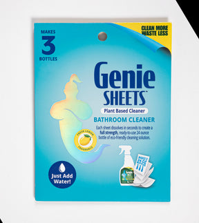 Genie Sheets are dissolvable cleaning sheets. Each sheet turns into a full-strength bathroom cleaner when added to water. Designed to tackle soap scum, hard water stains, and grime.