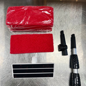 This Hood Cleaning Kit is designed to simplify the cleaning of stainless steel surfaces and other hard-to-reach areas. Featuring an angle adapter for enhanced maneuverability, the kit comes with durable scour pads specifically crafted to scrub stainless steel effectively without damaging surfaces. Perfect for cleaning exhaust hoods, vents, and other challenging areas, this kit is a must-have for commercial kitchens and industrial cleaning tasks. Proudly 100% made in America.