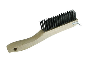 The Wood Shoe Handle Scratch Brush with Scraper features tempered carbon steel bristles for aggressive cleaning and rust removal, paired with a built-in scraper for tackling stubborn debris. The solid hardwood or plastic handle is contoured for a comfortable grip, making it ideal for heavy-duty surface prep.
